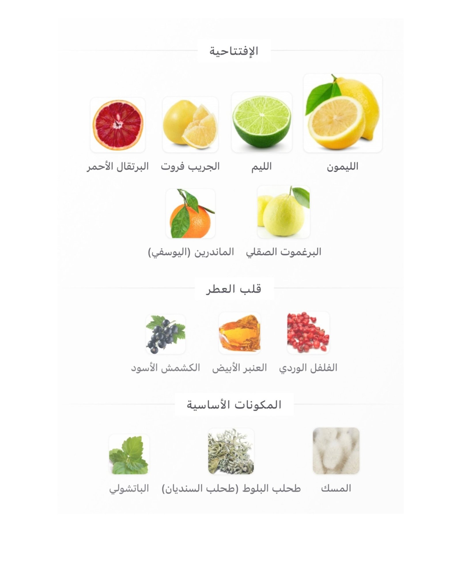 إفتتاحية العطر الليمون, الليم, الجريب فروت, البرتقال الأحمر, البرغموت الصقلي و الماندرين (اليوسفي);
