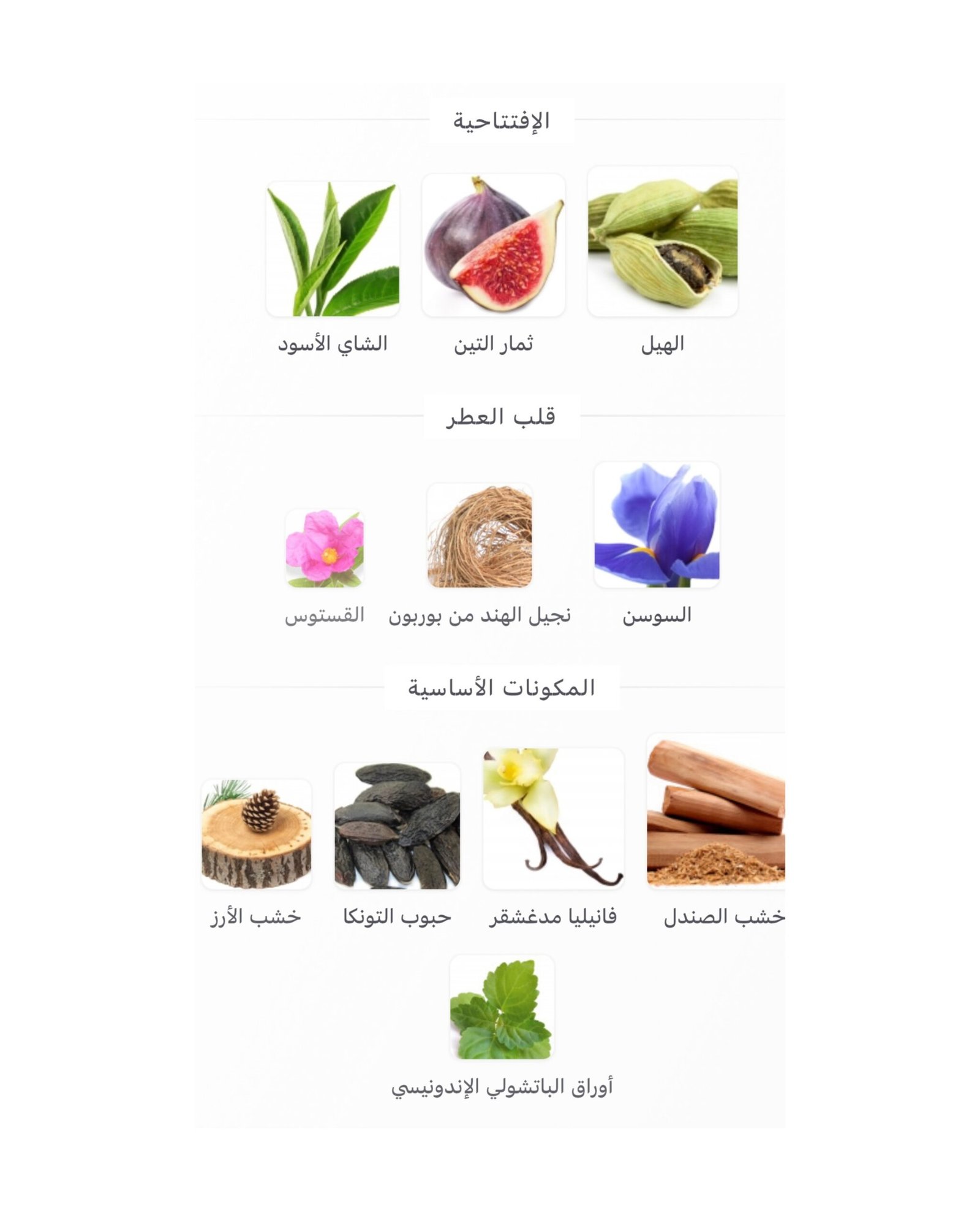 قاعدة العطر تتكون من خشب الصندل, فانيليا مدغشقر, حبوب التونكا, خشب الأرز و أوراق الباتشولي الإندونيسي.