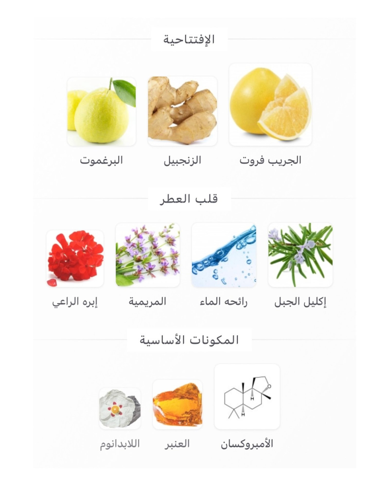 قاعدة العطر تتكون من الأمبروكسان, العنبر و اللابدانوم.