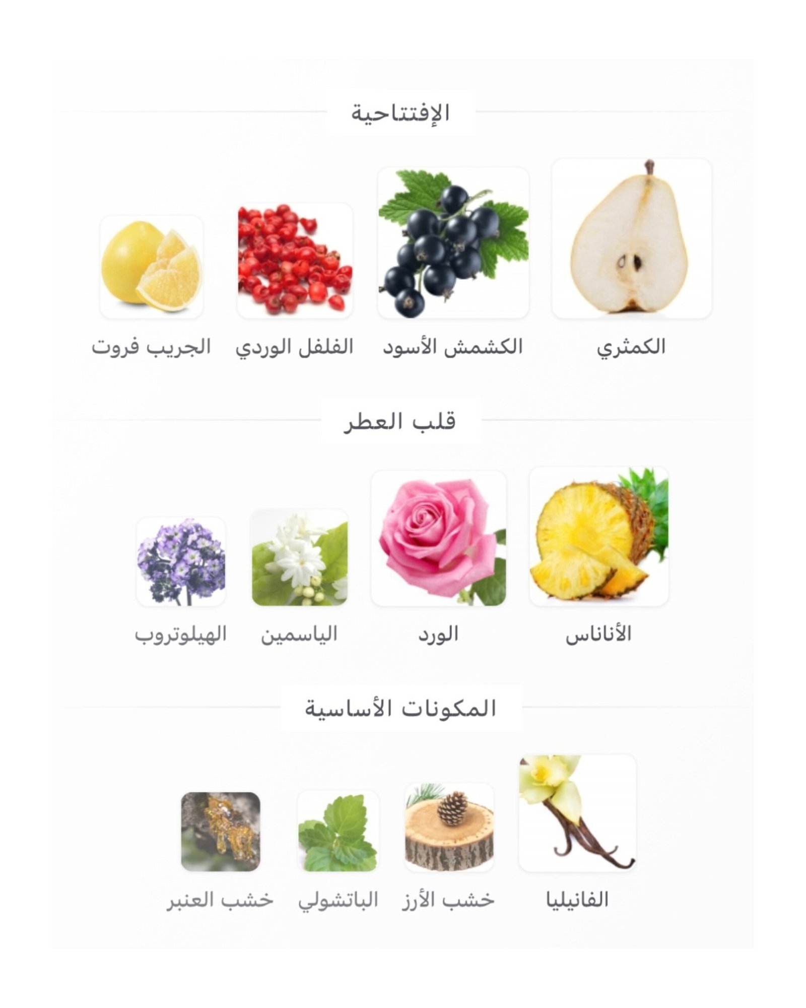 قاعدة العطر تتكون من الفانيليا, خشب الأرز, الباتشولي و خشب العنبر